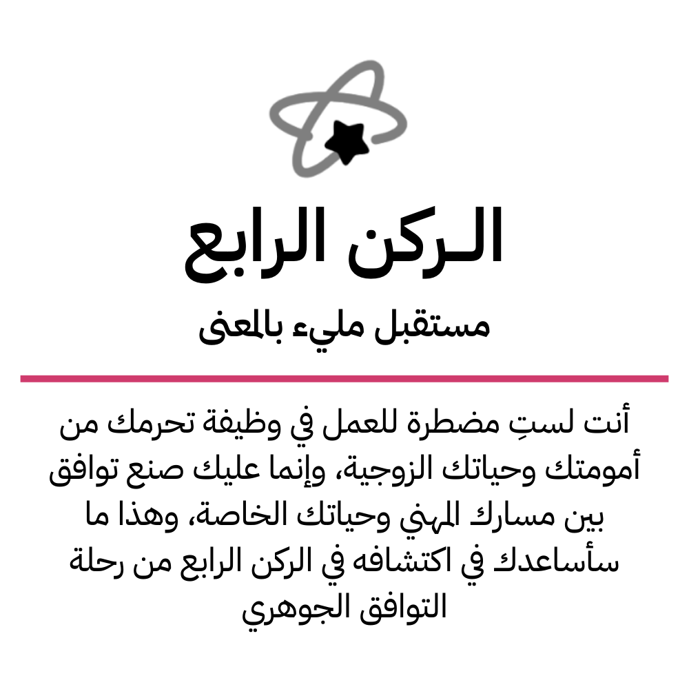 ليس عليكِ التضحية بلحظاتك الأسرية أو العمل في مجال لايستهويك، عبر خمس أركان فقط يمكنك تحديد المسار المهني الذي يدعم قراراتك الشخصية والأسرية لتحققي الانسجام بين ذاتك وإنجازاتك.