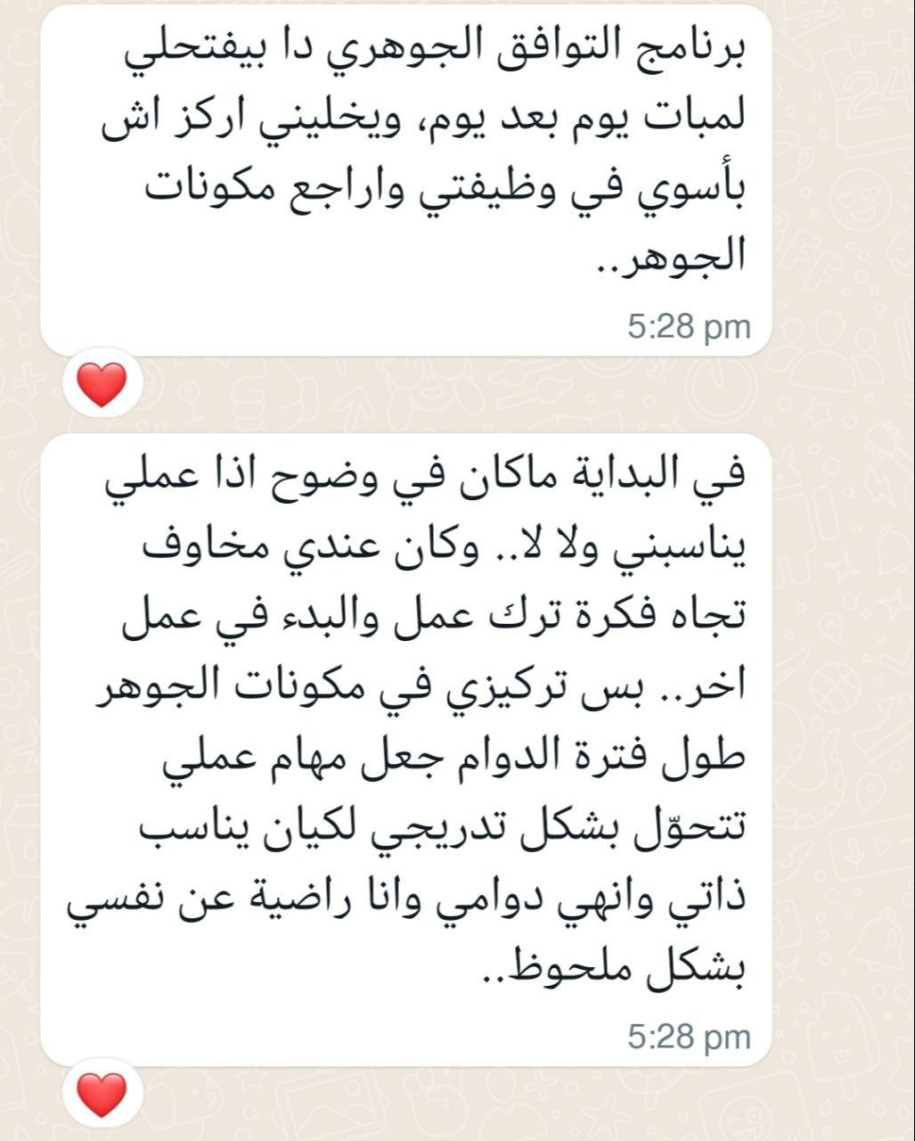 ستكونين بعد رحلة التوافق الجوهري قادرة على تحديد أهداف حياتك بوضوح ومتمكنة من السعي في مسارك المهني المناسب، ومرتاحة في علاقاتك ومتوازنة في ذاتك