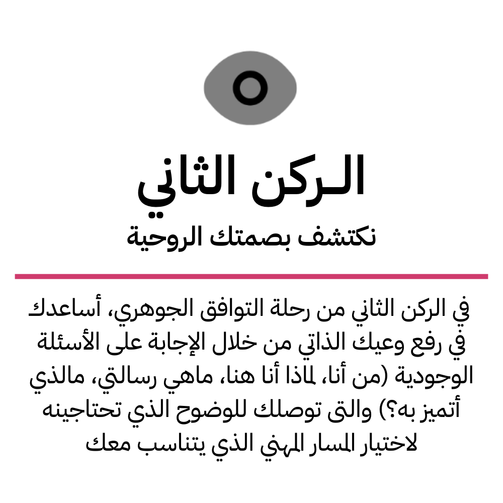 نعمل على اكتشاف بصمتك الروحية وما تتضمنه من قيمك الجوهرية، هدفك الأسمى في الحياة، قدراتك الكامنة ومهاراتك الفطرية بالتالي تختاري أولوياتك الفعلية لا مايفرضه المجتمع عليك.